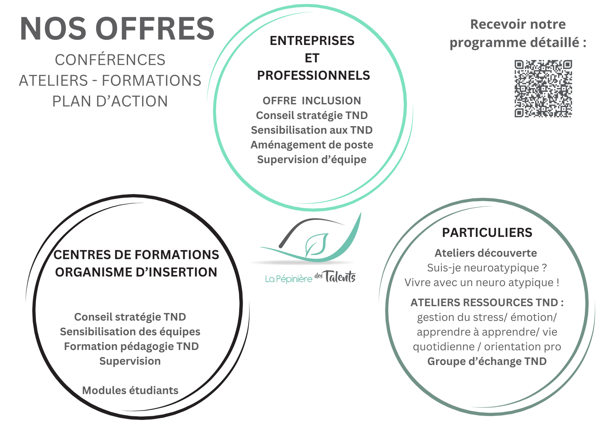 Parce que nous avons à cœur de sensibiliser, d'accompagner et de former, la Pépinière des Talents organise des rencontres, des conférences, débats, stages, ateliers et séminaires sur les TND.